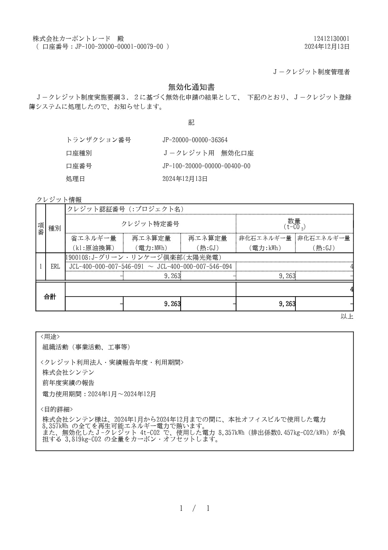 J-クレジット制度においてカーボンオフセットを実施した証「無効化通知書」