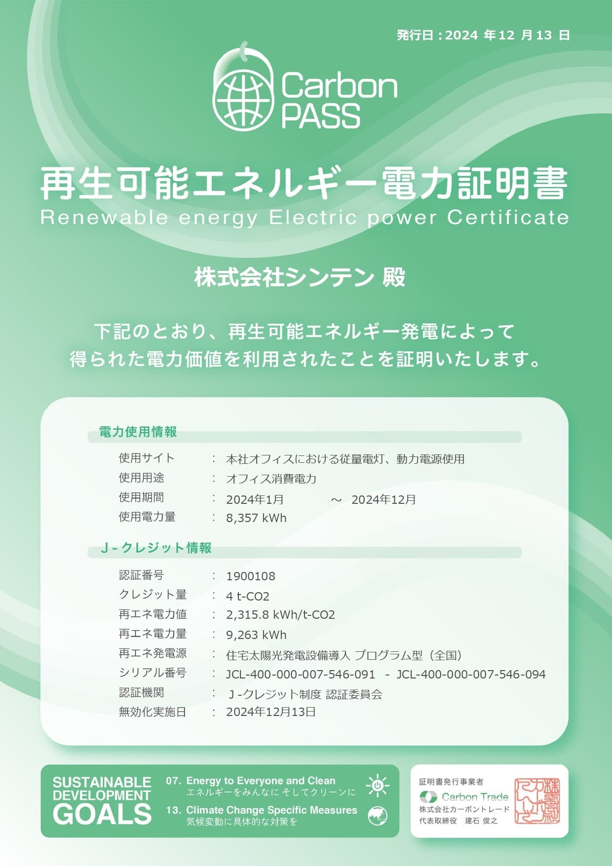 2025年/1月 | 本社オフィスにおける従量電灯、動力電源において再生可能エネルギーによって得られた環境価値を充当し、排出CO2実質ゼロにしました。 |