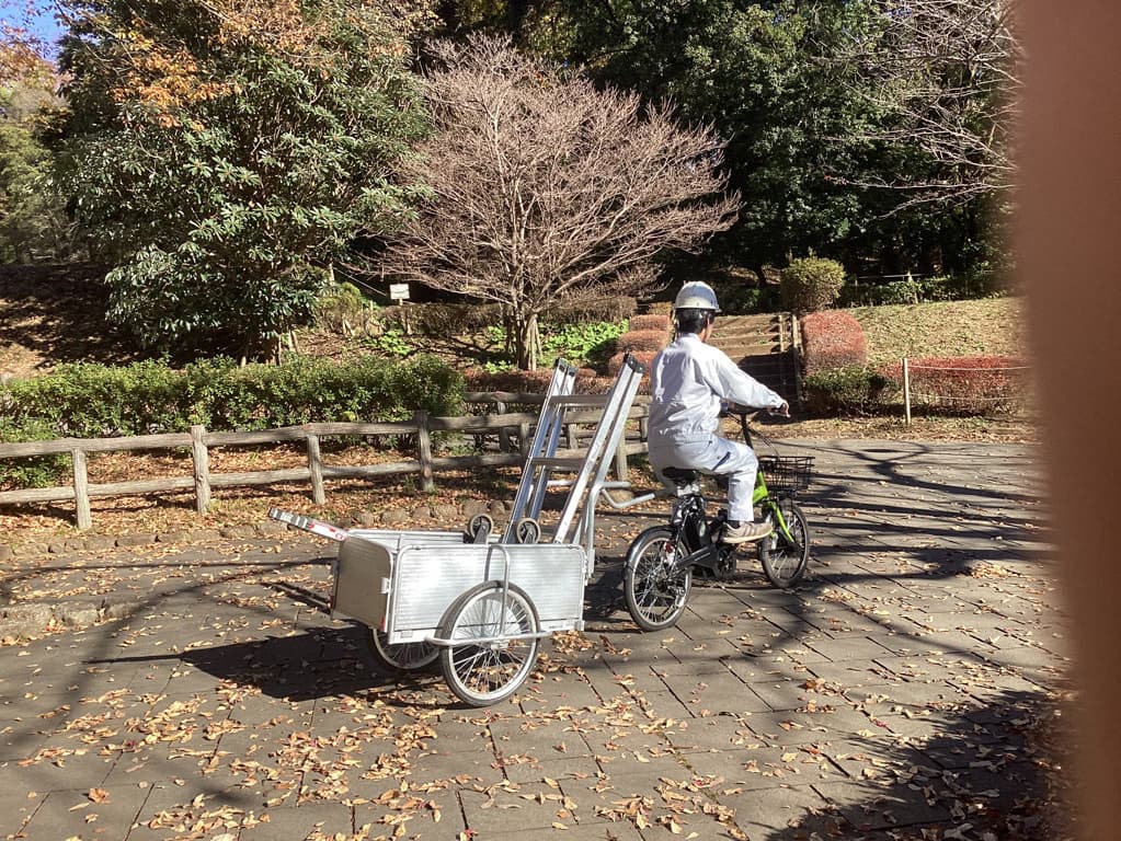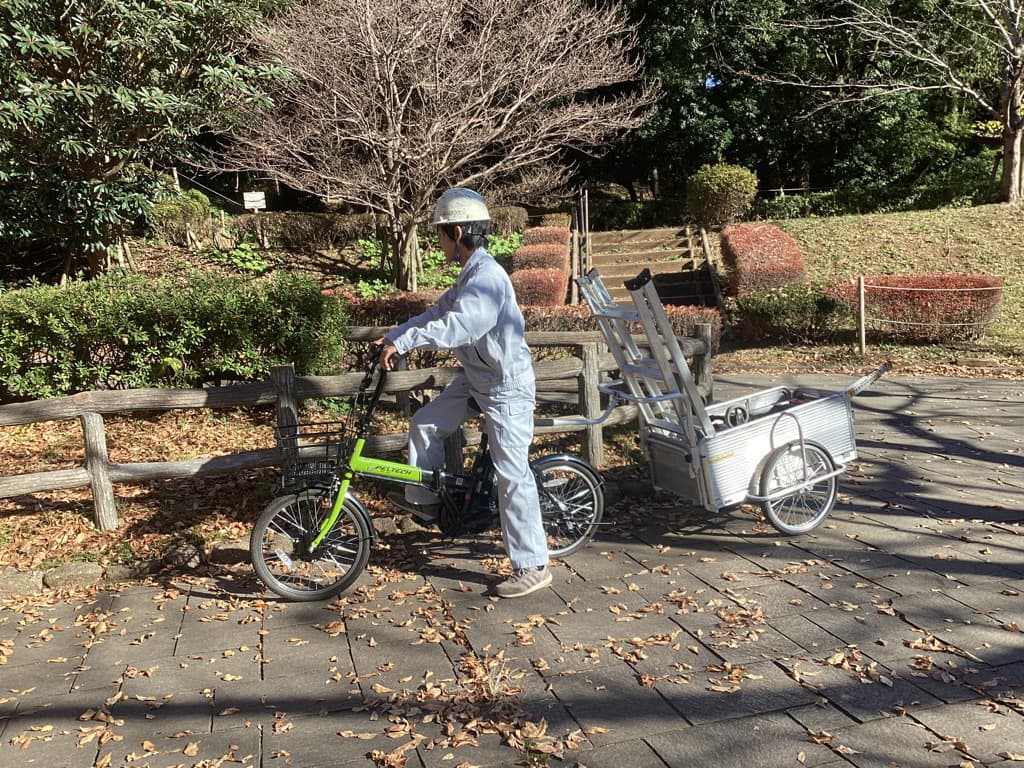 施設移動距離の短い地域や住宅密集地で車両の入りにくい地域では、点検工具、計器、脚立、等をリヤカー載せ、自転車に連結して施設を移動しながら点検をおこなっています